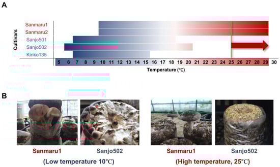 Strain selection for analysis of high-temperature tolerance of Lentinula edodes. (A) Fruiting temperature range of high-temperature-tolerant (Red lines, Sanmaru1 and Sanmaru2) and high-temperature-sensitive (Blue lines, Sanjo501, Sanjo502, and Kinko135) cultivars. Red arrow indicates temperature range for thermo-tolerant cultivars, including Sanmaru1 and Sanmaru2. (B) Fruiting phenotypes of Sanmaru1 and Sanjo502 grown under low (10 °C) and high (25 °C) temperature conditions. Sanmaru1 showed fruiting body formation under both high and low temperature conditions, whereas Sanjo502 showed fruiting body formation under only low temperature conditions.