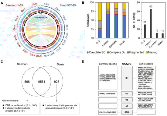 Overview of whole-genome sequences of monokaryotic Sanmaru1-33 and Sanjo502-23. (A) Whole-genome sequence assembly of Sanmaru1-33 (Sanmaru) and Sanjo502-23 (Sanjo) strains. A total of 12 and 11 contigs of Sanmaru and Sanjo, respectively, were anchored to the chromosome-level genome map (Lemap 2.0) reported by Zhang et al. []. Each track in the Circos plot, from the outside in, represents the following: each chromosome anchored to Lemap 2.0 (1st track); GC content (%) (2nd track); gene density (3rd track); transposable element (TE) density (4th track); and synteny blocks conserved between Sanmaru and Sanjo (5th track). (B) Quality assessment of Sanmaru and Sanjo assemblies. The left panel shows BUSCO scores for B17 [], Lemap, Sanmaru, and Sanjo assemblies. The results are categorized as complete and single-copy (Complete.SC), complete and duplicated (Complete.Du), fragmented, or missing BUSCOs. The right panel shows the number of assembled contigs in these four species. (C) Overlap of gene orthologous clusters between Sanmaru and Sanjo. Significant GO-enriched terms for species-specific orthologous genes with p-values are presented in the bottom rectangular box. (D) Carbohydrate-active enzyme (CAZyme) annotation for genes specific to Sanmaru and Sanjo.