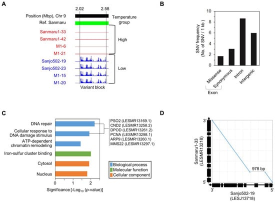 To investigate genetic variation between resistance and sensitivity to high temperature, samples derived from Sanmaru (resistant; including Sanmaru1-33, Sanmaru1-42, M1-6, and M1-21) and Sanjo (sensitive; including Sanjo502-19, Sanjo502-23, M1-15, and M1-20) were re-sequenced (Supplementary Table S2). Based on the draft genome of Sanmaru, we analyzed single nucleotide variants (SNVs) between the two groups. We focused on regions where SNVs occur in a structurally consecutive manner (regions with variations spanning over 50 kb) and where homozygous variants oppose each other for the two traits. From the genome-wide SNP data, we extracted genotypes where the resistant samples had homozygous reference (REF) alleles, and the sensitive samples had homozygous alternative (ALT) alleles. As a result, we identified a large variant block (VB) approximately 560 kb in length, with densely distributed SNVs on chromosome 9 between the Sanmaru and Sanjo groups (Figure 3A). Within the VB region, a high frequency of SNVs in genic regions was observed: 1.7 for missense, 3.1 for synonymous, and 8.7 for intron variants per gene (Figure 3B). This variant block is likely associated with the thermo-tolerant trait for fruiting body formation in Sanmaru compared to Sanjo. This genetic event suggests the hypothesis that genetic recombination does not occur to preserve high-temperature resistance in Sanmaru. In connection with the functional annotation of all genes within the VB region, we identified an enrichment of genes associated with DNA repair (p-value = 0.006), including PSO2, CND2, DPOD, PCNA, ARP9, and MMS22 (Figure 3C). Additionally, structural differences at the 5′-upstream region of the phospholipase C 1-encoding gene (PLC1) in the VB region were identified (Figure 3D).