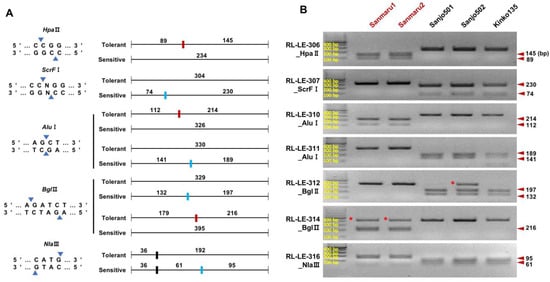 CAPS markers associated with high-temperature tolerance of fruiting body formation. (A) The restriction enzymes used in the development of CAPS markers and schematic diagrams illustrating the position of the restriction enzyme recognition sites in the marker sequence of each allele. The fragment sizes of PCR and CAPS products are shown. Additional restriction enzyme recognition sites unrelated to the target SNP (RL-LE-316_NlaIII) are indicated by black boxes. The red and blue boxes represent the restriction enzyme-recognizing and non-recognizing sites present in the high-temperature tolerance allele, respectively. (B) The cleaved fragment patterns of each CAPS marker among five L. edodes cultivars. Sanmaru1 and Sanmaru2 show the high-temperature-tolerant allele-specific fragment pattern. Arrowheads indicate the position of putative high-temperature-tolerant allele-specific fragments. Asterisks represent undigested bands.