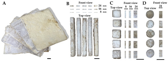 Example specimens of MBCs obtained from L. sajor-caju and corn husk and sawdust in this study. Mycelium composite boards (A). Specimens for modulus of elasticity and bending strength testing (B), specimens for water absorption measurement, thickness of swelling, shrinkage, and thermal conductivity measurement (C), and specimens for sound absorption coefficient measurement (D). Scale bar = 50 mm.