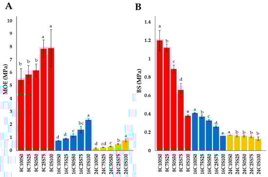 Modulus of elasticity [MOE; (A)] and bending strength [BS; (B)] of MCBs in this study. Red, blue, and yellow bars indicate MCBs with thicknesses of 8 mm, 16 mm, and 24 mm, respectively. The different letters within the same group of MCB thickness indicate a significant difference according to Duncan’s multiple range test (p ≤ 0.05).