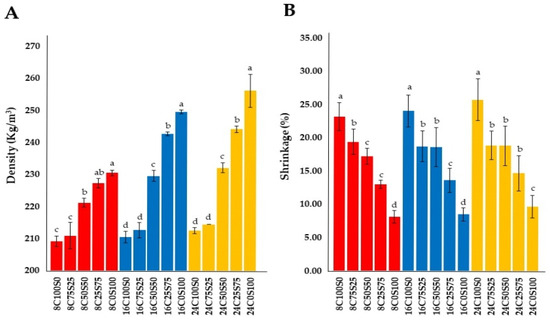 Density (A) and shrinkage (B) of MCBs in this study. Red, blue, and yellow bars indicate MCBs with thicknesses of 8 mm, 16 mm, and 24 mm, respectively. The different letters within the same group of MCB thickness indicate a significant difference according to Duncan’s multiple range test (p ≤ 0.05).