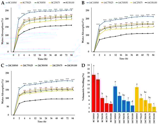 Water absorption behavior of MBC specimen’s thickness at 8 mm (A), 16 mm (B), and 24 mm (C) and volumetric swelling (D) in this study. *, **, *** in subfigures (A–C) indicate significant differences according to Duncan’s multiple range test (p ≤ 0.05). Red, blue, and yellow bars in subfigures (D) indicate MCBs with thicknesses of 8 mm, 16 mm, and 24 mm, respectively. The different letters within the same group of MCB thickness in subfigures (D) indicate a significant difference according to Duncan’s multiple range test (p ≤ 0.05).