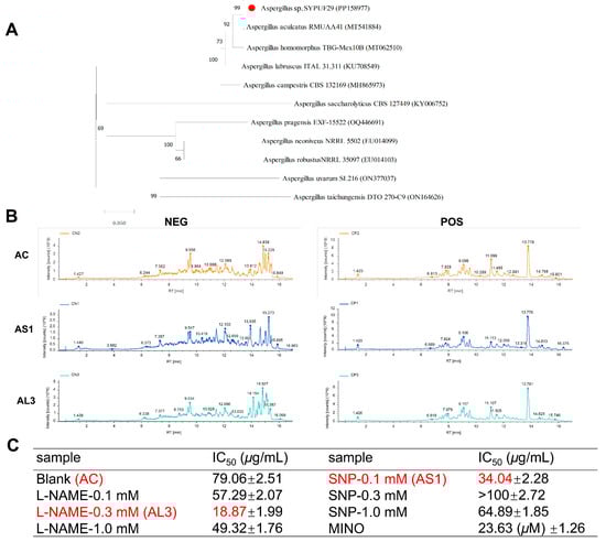 Figure 1. (A) The morphology by analysis, and neighbor-joining tree based on ITS sequences showing relationships between strain Aspergillus sp. SYPUF29 and closely related members of Aspergillus sp.; (B) the base peak ion (BPI) of the metabolites of Aspergillus sp. SYPUF29 with/without NO in the positive and negative mode; (C) effects of extracts after SNP and L-NAME administrated on NO production in LPS-activated BV-2 microglia cells (L-NAME-0.1/0.3/1.0 mM: the EtOAc extracts when Aspergillus sp. SYPUF29 was exposed to differential concentrations of L-NAME; SNP-0.1/0.3/1.0 mM: the EtOAc extracts when Aspergillus sp. SYPUF29 was exposed to differential concentrations of SNP; MINO: minocycline, as the positive control); IC50 represents the concentration of extracts that is required for 50% inhibition of NO production.