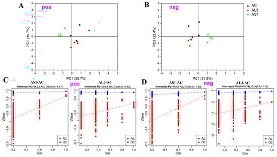 Figure 2. (A,B) PCA plot between the AS1, AL3, and AC in positive− and negative−ion mode. (C,D) The parameters of the PLS−DA model from AS1 vs. AC, AL3 vs. AC in positive− and negative−ion mode.