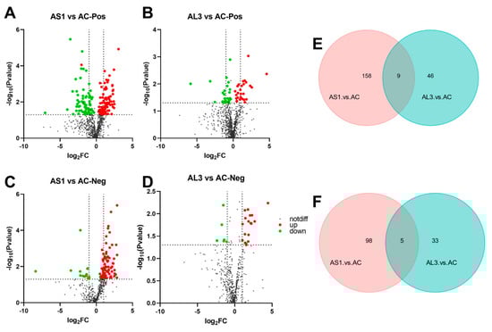 To find out the different metabolites between the three extracts, the metabolites were chosen by the fold change (FC > 1.2 or FC < 0.833) with significant differences (p < 0.05), and, further transforming the fold changes (FCs) to log2FC, the up-regulated metabolites have a positive number of log2FCs. Similarly, the negative number of log2FCs indicated down-regulated metabolites. As shown in Figure 3A–D, the volcanic map analysis based on the different components in three extracts demonstrated that the majority of the differential metabolites were significantly upregulated after being SNP-stimulated. In the positive model, although all two extracts of AS1 and AL3 yield a set of 9 shared metabolites, the AS1 vs. AC exhibited the largest number of differential metabolites (158 in number), while that number in the AL3 vs. AC set was only 46 (Figure 3E). Similarly, it is also noteworthy that AS1 showed the presence of a higher number of total metabolites in the negative model (Figure 3F).