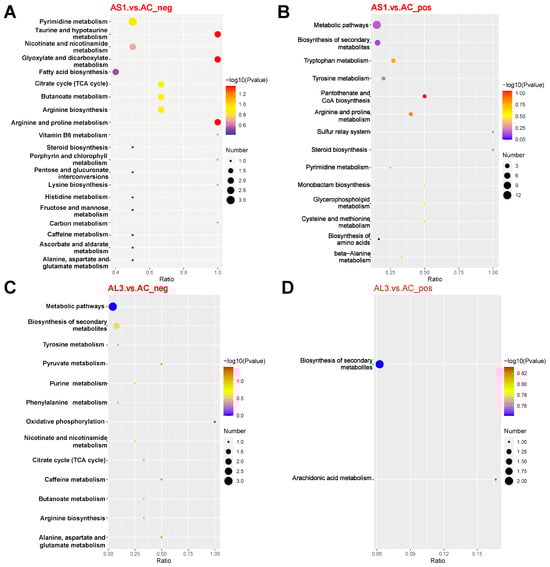 Figure 4. The KEGG-enriched pathways analysis of the AS1 vs. AC and the AL3 vs. AC in both positive (B,D) and negative (A,C) models.
