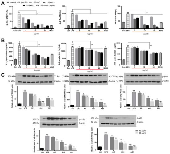 Figure 5. The effect of these extracts on the expressions of pro-inflammatory cytokines IL-1β, IL-6, and TNF-α in LPS-activated BV-2 cells using ELISA (A) and real-time PCR (B) and assay; (C) the protein levels of TLR4, MyD88, p-P65, p-IκB-α, and iNOS were examined by Western blot. Data are presented as mean ± SEM (n = 3). ### p < 0.001 vs. control group; * p < 0.05, ** p < 0.01, *** p < 0.001 compared with the LPS group.