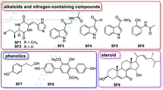 Furthermore, we measured the anti-neuroinflammation activities of these extracts and isolates (SF1SF9) from AS1, in LPS-induced BV2 cells. Among them, compound SF4 is the same one as that identified from the extract of AS1 (Figure S1, compound 18), and SF3SF5 all belong to the family of indole alkaloids derived from the tryptophan. In addition, SF4 (indole-3-carboxaldehyde) could inhibit intestinal inflammation on the TLR4/NF-kB/p38 signaling pathway, and balance amino acid metabolism in mice with colitis [43]. 2-Acetamidophenol (SF6) is an aromatic compound with the potential for anti-inflammatory activity, and has been widely used in the pharmaceutical industry [44]. SF8 (terphenyllin) could suppress the growth and metastasis of gastric cancer by inhibiting the STAT3 signaling pathway [45], also showing significant neuroprotective effects against oxidative stress in Neuro-2a Cells [46]. Taken together, our results indicated that alkaloids and nitrogen-containing compounds generated by Aspergillus after SNP was administered have shown potential to treat inflammation-related disease, while further in-depth biological testing needs to be carried out.