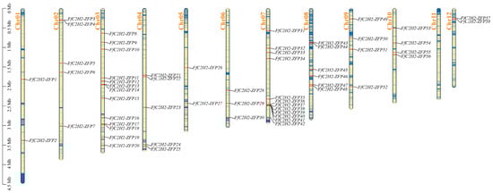 To investigate the chromosomal distribution of the FfC2H2-ZFP genes, we utilized the whole genome sequence of F. filiformis for localization analysis, employing TBtools-II [31] to effectively visualize and present the data. Our findings revealed clear chromosomal locations for all the FfC2H2-ZFP genes, with a total of 58 genes dispersed across 11 chromosomes, except for chromosome 11. The distribution of the FfC2H2-ZFP genes showed non-uniformity across the different chromosomes and exhibited no correlation with the chromosome length. Notably, chromosome 1, the longest chromosome, only contained two genes, while chromosome 3, a relatively shorter chromosome, housed thirteen genes. Distribution patterns were not apparent, although gene clusters were observed on chromosomes 3 (two genes) and 7 (five genes) (Figure 1). Furthermore, synteny analysis revealed the absence of collinear pairs of the FfC2H2-ZFP genes within the genome (Figure S1).