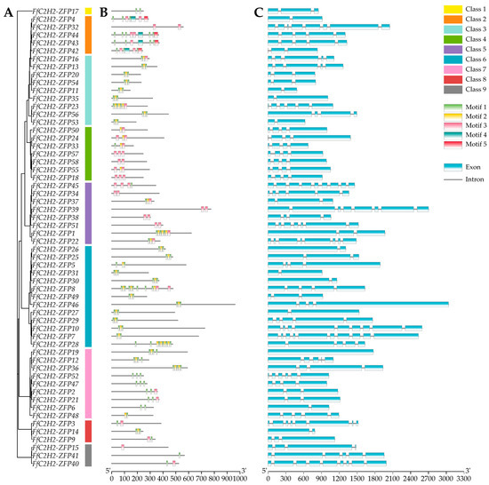 Figure 2. The analysis of the FfC2H2-ZFP genes in F. filiformis. (A) A phylogenetic tree was constructed using the maximum likelihood (ML) method, with a bootstrap value of 1000. (B) The conserved motifs (1–5) in the FfC2H2-ZFPs are depicted in different colors, with the gray lines indicating the relative protein length. (C) The gene structure is illustrated with exons as green rectangles and introns as gray lines.