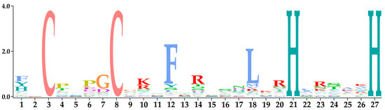 To analyze the structural domain characteristics of the C2H2-ZFPs in F. filiformis, the conserved structures were compared using multiple sequence alignments facilitated by Jalview software 2.11 [43]. Analysis revealed that the 58 FfC2H2-ZFPs contained 129 C2H2 domains, each consisting of 23–26 amino acids (Figure S3). Each domain was characterized by two cysteines and two histidines, with phenylalanine and leucine also showing relative conservation. The conserved structural domain (CX2-4CX12HX3-5H) was collectively formed by these residues, showcasing a significant degree of conservation within the FfC2H2-ZFPs (Figure 3).