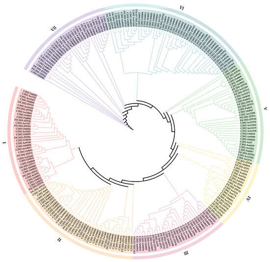 To examine the evolutionary relationships of the C2H2-ZFPs in F. filiformis compared to those of the other fungi, we analyzed 58 C2H2-ZFPs from F. filiformis, 39 C2H2-ZFPs from A. bisporus, 57 C2H2-ZFPs from L. bicolor, 18 C2H2-ZFPs from P. ostreatus, and 72 C2H2-ZFPs from A. ostoyae. A phylogenetic tree was created employing the maximum likelihood approach, accompanied by a bootstrap support of 1000. Based on sequence similarity and phylogenetic tree topology, the C2H2-ZFPs were categorized into seven distinct groups: I, II, III, IV, V, VI, and VII. In F. filiformis, the distribution of the C2H2-ZFPs across these groups varied, with nine in group I, eight in group II, eight in group III, nine in group IV, eight in group V, ten in group VI, and eight in group VII (Figure 5). The percentages of the FfC2H2-ZFPs in F. filiformis within each group, relative to the total number of the C2H2-ZFPs in that group, were as follows: 25.71% for group I, 19.51% for group II, 28.81% for group III, 40.91% for group IV, 23.53% for group V, 20.41% for group VI, and 18.75% for group VII.