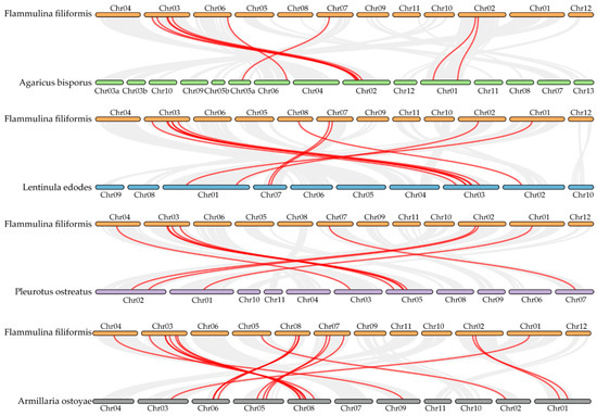 Figure 6. Synteny analyses of the C2H2-ZFP genes in F. filiformis compared to those of four other species. Collinear regions in F. filiformis are connected to those in other genomes using gray lines, with red lines indicating syntenic C2H2-ZFP gene pairs.