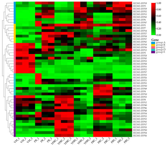 To investigate the expression patterns of the FfC2H2-ZFP gene family, transcriptome data from 58 FfC2H2-ZFP genes in the various tissues of F. filiformis were analyzed. These tissues included the following: the vegetative mycelium (VM), the primordium (PR), the young fruiting body cap (YFBC), the fruiting body cap (FBC), the young fruiting body stipe (YFBS), and the fruiting body stipe (FBS). Analysis revealed distinct expression patterns among the different FfC2H2-ZFP genes, with most genes being expressed in all the tissues. Out of the 58 genes, 49 showed expression, with the FPKM values ranging from 1 to 619 (Figure 7, Table S5), while the remaining 9 genes had FPKM values below 1 in all the tissues, indicating non-expression. In light of the similarities observed in their expression profiles, the 49 expressed genes were divided into five distinct groups: Group A revealing higher expression levels in the primordia and stipe; Group B showing higher expression levels in the fruiting bodies; Group C demonstrating high expression levels at the mycelial stage; Group D displaying no significant changes in expression across the tissues; and Group E showing enhanced expression in the pileus.