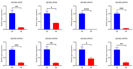 Figure 8. Relative expression levels of 8 FfC2H2-ZFP genes across samples with different stipe regions: elongation region (ER) and stable region (SR). Error bars represent the standard error of mean (SEM) calculated from three biological replicates. Asterisks indicate significant differences in gene expression following treatment (* p < 0.05, ** p < 0.01, *** p < 0.001, **** p < 0.0001; t-test).
