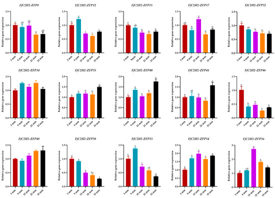 Figure 9. Relative expression levels of 15 FfC2H2-ZFP genes across samples with different pileus sizes: 3 mm, 9 mm, 15 mm, 21 mm, and 33 mm. Error bars represent the standard error of mean (SEM) calculated from three biological replicates. Different letters indicate significant differences in gene expression after treatment (p < 0.05; one-way ANOVA).