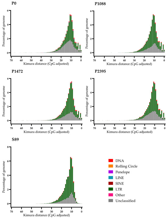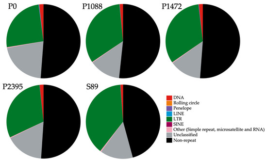 Therefore, transposable element (TE) annotation was performed using Earl Grey v4.03 [36] on the four genome assemblies from our study and the strain S89 genome assembly from Brazil (Table 1). The annotated sequences of TEs in the genomes of Mexican pathotypes constituted 48.78% for P0, 48.3% for P1088, 48.8% for 1472, and 48.93% for P2395, whereas for the Brazilian strain S89, the percentage was higher (54.39%) (Figure 1).