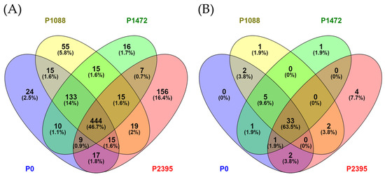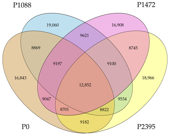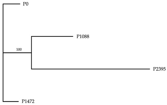 Genome sequencing generated 32,424,538 reads for P0, 26,793,550 for P1088, 32,183,896 for P1472, and 31,500,326 for P2395. The total number of bases (bp) were 4.90 Gb for P0, 4.0 for P1088, 4.86 for P1472, and 4.76 for P2395. After quality control, raw data filtering, and assembly, the four whole genomes exhibited a range of sizes from 98.1 to 101.8 Mb and were assembled into 24,410 to 29,513 scaffolds, with a N50 from 28.42 to 33.05 Mb, a GC content from 38.7 to 38.9%, and 11,859 to 12,225 predicted genes (Table 1).