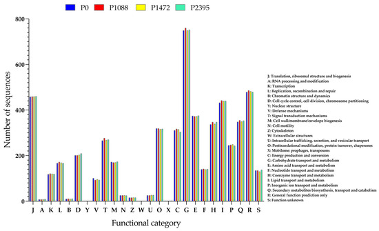 Approximately 50% of the annotated single-copy orthologous genes for all pathotypes could be assigned to COGs (Table 3). Pathotype P1088 had a higher number of orthologous genes (5503) than P0 (5439), P1472 (5452), and P2395 (5470) (Figure 5). However, the number of orthologous genes was lower than in other Colletotrichum species, e.g., a total of 7306 orthologous genes have been identified as conserved in C. fructicola, C. orbiculare, C. gloeosporioides, C. sublineola, and C. fioriniae [62].