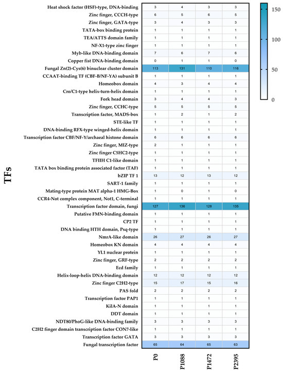 The repertoire of transcription factors (TFs) or TFomes identified between the pathotypes revealed 45 families typically found in more than 200 fungal genomes [63]. Each pathotype exhibited a different total number of genes: 395 in P0, 423 in P1088, 394 in P1472, and 403 in P2395 (Supplementary Table S4). However, two pathotypes (P1088 and P2395) had a higher and similar number of genes whereas the other two (P0 and P1472) a lower and similar number. As proposed by Shelest [63], 34 families are small (with less than five genes), and 11 families are abundant (with five or more genes) (Figure 6). Two families exhibited the highest gene abundance: the fungal-specific TF domain family (ranging from 127 to 136 genes among pathotypes) and the fungal Zn(2)-Cys(6) binuclear cluster domain family (Zn2Cys6_DnaBD) (ranging from 110 to 131 genes among pathotypes) (Figure 6 and Supplementary Table S4).
