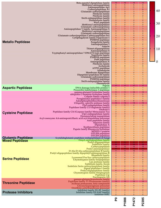 Metallopeptidases belonging to eight clans containing 33 families were the most diverse. They included peptidases for nuclear, cytoplasmic, vacuolar, mitochondrial, and extracellular (secreted) functions, and others whose biological functions are unknown (Figure 7). Secretion metallopetidases of included a fungalysin gene (family M36), which is a virulence factor involved in the degradation of chitinases in C. graminicola and other fungi [81,82]. Moreover, four deuterolysin genes (M35 family) were identified in M. oryzae, one of which has a the role of an effector [83] and three to four cytophagalysin genes (M43B family) were identified in Phytophthora infestans, described as necessary for virulence [84]. The cysteine peptidases identified belong to five clans containing 18 families, including peptidases for cytoplasmic, nuclear, and lysosomal functions and others with unknown functions (Figure 7). The genes for calpains and caspases, and those involved in ubiquitin release, are found among cysteine peptidases. Threonine peptidases belong to one clan with four families, including proteases with functions in the endoplasmic reticulum, Golgi, proteasome, and metabolism (Figure 7). Aspartic peptidases belong to one clan and one family, and mainly include members of the pepsin family. In addition, the glutamic peptidase corresponds to fungal scytalidoglutamic endopeptidase and mixed peptidase is an aminopeptidase (Figure 7).
