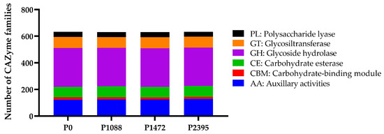 Genomic, transcriptomic, and proteomic analyses allowed us to determine that fungi secretes a large number of diverse CAZymes, which are associated with their nutritional strategies and host specificities [21]. CAZymes have a function in carbohydrate synthesis, metabolism, and biotransformation of carbohydrates and are classified into six large families: glycoside hydrolases (GHs), with the carbohydrate binding module (CBM), carbohydrate esterases (CEs), polysaccharide lyases (PLs), glycosyl transferases (GTs), and auxiliary activities (AAs) [94,95]. In this study, the genes encoding CAZymes belonged to 131 families with a high similarity in content for all pathotypes, ranging from 630 to 633 genes (Table 7 and Figure 9). Sixteen families showed a differential number of genes between the pathotypes, and eighteen families were most strongly represented (Figure 10).