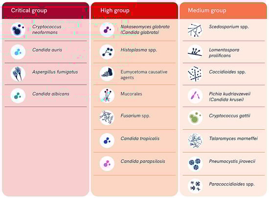 The fungal population is estimated to include over 3.8 million species distributed throughout the world. However, most of them are understudied and poorly characterized [1]. Most of these species infect humans, animals, and/or plants around the world; nevertheless, they are commonly severely neglected, mainly because of their historically limited distribution in low- and middle-income countries in the tropical and subtropical regions. Fungal infections (FIs) tend to progress gradually, and the delays in detecting them, combined with a lack of effective case management, contribute to the development of their significant burden and impacts, particularly in resource-limited settings. They contribute heavily to diseases morbidity, mortality, and disability, resulting in a severe socioeconomic burden, with over 1.5 million deaths annually attributed to FIs [2]. Therefore, the World Health Organization (WHO) has released a list of fungal pathogens of high priority in healthcare, public health, and research (Figure 1) [3,4,5]. Fungal pathogens in this list are ranked into three categories including critical, high, and medium priority (Figure 1). This ranking was conducted based on the public health significance and emergence of antifungal resistance to the currently available antifungal drugs [3,4,5].