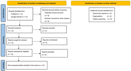 - Page, M.J.; McKenzie, J.E.; Bossuyt, P.M.; Boutron, I.; Hoffmann, T.C.; Mulrow, C.D.; Shamseer, L.; Tetzlaff, J.M.; Akl, E.A.; Brennan, S.E.; et al. The PRISMA 2020 Statement: An Updated Guideline for Reporting Systematic Reviews. BMJ 2021, 372, n71. [Google Scholar] [CrossRef] [PubMed]