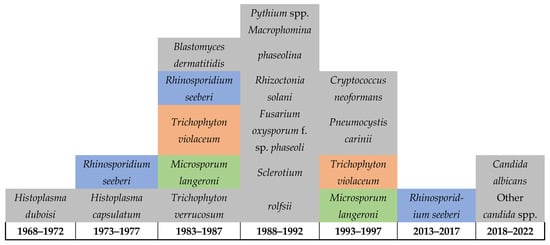 Our systematic search identified 10 reports about FIs in Rwanda that were published between 1972 and 2022 (Figure 2) [18,19,20,21,22,23,24,25,26,27]. Among the identified FIs, there were two reports on candida infections, two reports on Histoplasma spp. and dermatophytes, and one report on Blastomyces dermatitidis, Rhinosporidium seeberi, Cryptococcus neoformans, and Pneumocystis carinii each.