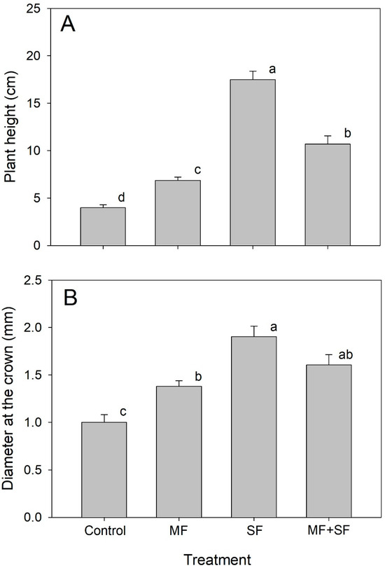 The study’s findings reveal a positive influence of the utilized microorganisms (MF and SF) on the height and diameter growth of Q. saponaria plants, observed eleven months post-application. Figure 1A illustrates that the most favorable response in height was observed in plants treated with C. rigida or in combination with G. roseae. Statistically significant differences were evident between these treatments and plants inoculated solely with the MF G. roseae, as well as compared to control plants, which exhibited the least height growth. Inoculation with C. rigida increased plant height by 337.5% and the MF + SF treatment by 167.5% compared to control plants. The results regarding the diameter variable (Figure 1B) exhibit a pattern like that observed for height. Plants treated with C. rigida attained the largest diameter, followed by those treated with the MF + SF combination. In contrast, control plants exhibited the lowest growth in diameter. These findings indicate significant differences between the treatment with C. rigida and both the MF G. roseae treatment and the control, as well as significant statistical differences between the MF + SF treatment and the MF G. roseae treatment compared to the control.