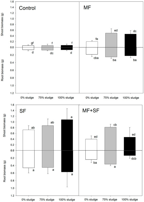 Aerial and radicle biomass of Q. Saponaria plants inoculated with the MF G. roseae and SF C. rigida, or their combination (MF + SF), under increasing doses of residual sludge. Different letters denote significant differences (Tukey test p < 0.05).