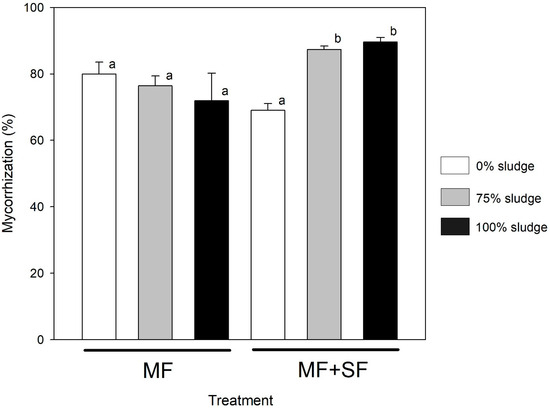 Mycorrhization % in Q. saponaria plants inoculated with the MF G. roseae or with a combination of MF + SF (G. roseae and C. rigida) after the addition of increasing concentrations of waste sludge. Different letters denote significant differences (Tukey test p < 0.05).