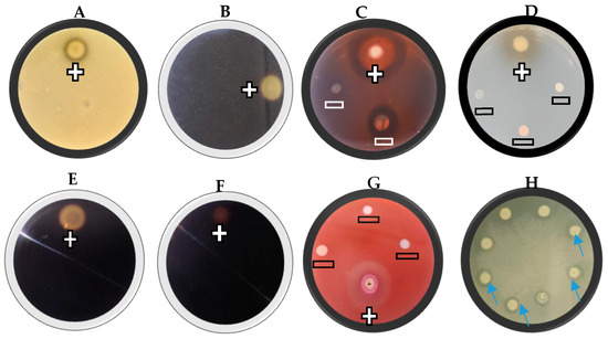 A representative example of the extracellular lytic enzyme activity of selected yeast isolates, proteases (A), chitinase (B), β-1,3-Glucanase (C), β-glucosidase (D), cellulase (E), starch (F), pectinase (G), and lipase (H). The positive sign (+) represents enzyme activity and the negative sign (−) represents no enzyme activity. For lipase activity, the arrows show clear halos around the colonies. This is a representative example of three replicates.