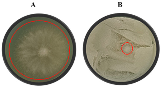 A radial inhibition assay was conducted using the agar plate method as described by Núñez et al. [29]. Yeast cell suspensions (1 × 108 cells/mL) were prepared from yeast culture broths, and 100 µL of each suspension was spread evenly on YMA plates with a Drigalski spatula and allowed to dry. Subsequently, 15 µL of a B. cinerea spore suspension (1 × 105 spores/mL) was spotted at the centre of each plate (Figure 3), with each treatment conducted in triplicate. Negative control plates contained only the 15 µL spore suspension at the centre of the YMA. The plates were incubated at 25 °C for 5–9 days. The mould radial inhibition (MRI) was calculated as follows: