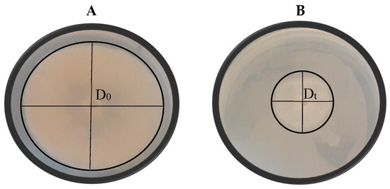 with D0 representing the average horizontal growth of the mould colony in the negative control and Dt representing the average horizontal growth of the fungal colony on the yeast-treated plates (Figure 2), as described by Núñez et al. [29].
