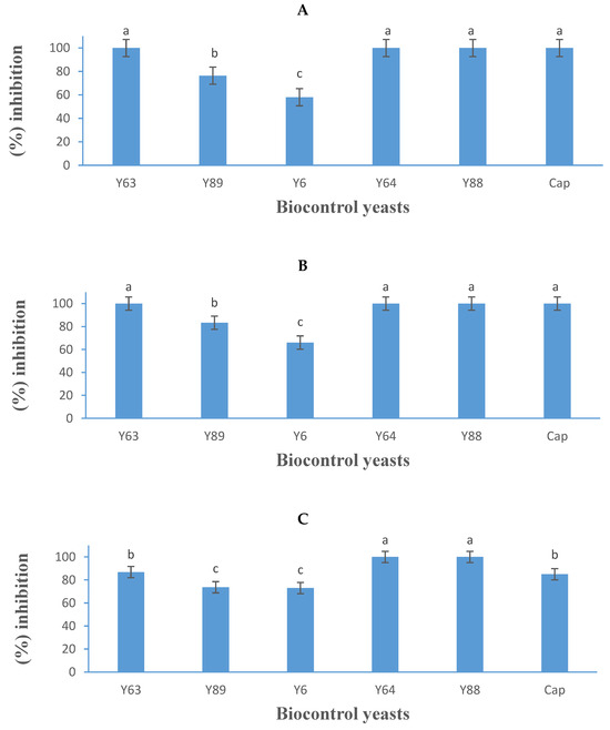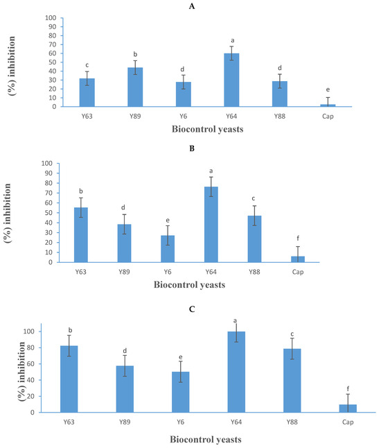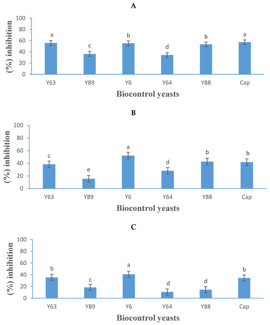 Growth inhibition activity (expressed as a percentage) of five yeasts (details listed in Table 2) and Captan (Cap), a commercial fungicide against Botrytis cinerea B05.10 (A), IWBT-FF1 (B), and PPRI 30807 (C) using the dual-culture assay. Values are means of three replicates and the standard deviations are also shown. Different letters indicate significant differences (p ≤ 0.05) between treatments. The plates of negative control treatments only contained the respective moulds and were the references for determining growth inhibition.