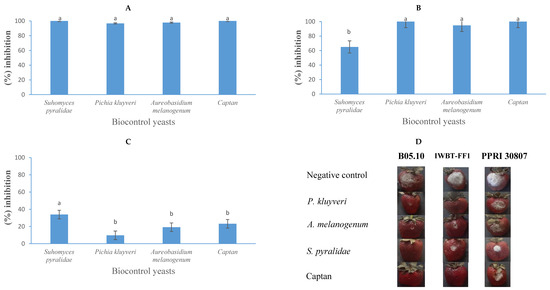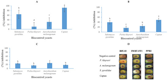 The growth inhibition activity (%) of Suhomyces pyralidae (Y63), Aureobasidium melanogenum (Y6), and Pichia kluyveri (Y64) against Botrytis cinerea B05.10 (A), IWBT-FF1 (B), and PPRI 30807 (C) during post-harvest trials on apples. Values are means of five replicates and the standard deviations are also shown. The different letters indicate significant differences (p ≤ 0.05) between treatments. (D) Photographs of apples showing lesion diameters. Each set is a representative example of 25 apples. For the negative control treatments, the apples were only infected with the respective moulds, therefore no growth inhibition was observed.
