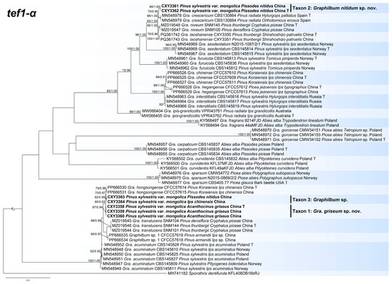 Notes: Graphilbum griseum was closely related to Gra. acuminatum and Gra. hongsongense in phylogenetic inferences (Figure 1 and Figures S1 and S2) [10,25]. Although these three species had an identical ITS sequence (Figure S1), they were distinct species based on phylogenetic analysis of tef1-α sequences (Figure 1). Graphilbum griseum can be distinguished from Gra. acuminatum and Gra. hongsongense by a hyalorhinocladiella-like asexual morph, which is pesotum-like in Gra. acuminatum and Gra. hongsongense. The optimal growth temperatures for the three species were 30 °C (Gra. griseum) and 25 °C (Gra. acuminatum and Gra. hongsongense). At 25 °C on 2% MEA, Gra. griseum grew slower than Gra. hongsongense (78.7 mm in 7 days vs. 76.3 mm in 4 days) and faster than Gra. acuminatum (11.2 mm/d vs. 5.8 mm/d). Furthermore, Gra. griseum was associated with Acanthocinus griseus from Pinus sylvestris var. mongolica in Jiamusi, China, whereas Gra. hongsongense was associated with Ips chinensis from Pinus koraiensis in Hegang, China. Graphilbum acuminatum used Pinus sylvestris and Picea abies as hosts and was associated with Ips acuminantus, Orthotomicus laricis, Pityogenes bidentatus, and Pityogenes quadridens in Europe.