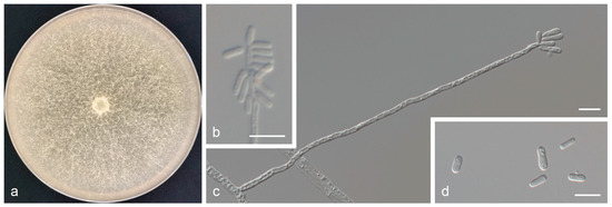Graphilbum griseum sp. nov. (a) Eight-day-old culture on 2% MEA; (b–d) Hyalorhinocladiella-like asexual morph: conidiogenous cells and conidia. Scale bars of (b–d) = 10 μm.
