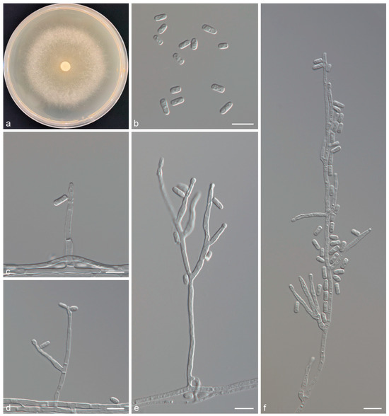 Graphilbum nitidum sp. nov. (a) Eight-day-old culture on 2% MEA; (b–f) Hyalorhinocladiella-like asexual morph: conidiogenous cells and conidia. Scale bars of (b–f) = 10 μm.