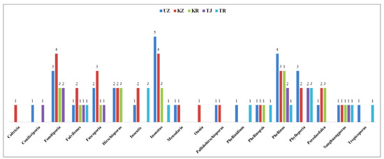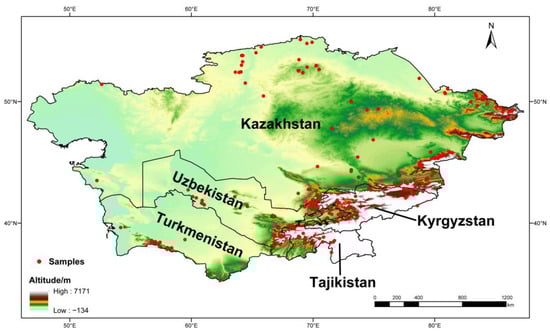 All abbreviations used in these localities are as follows: Five countries: Kazakhstan—KZ; Kyrgyzstan—KR; Tajikistan—TJ; Turkmenistan—TR; Uzbekistan—UZ; Provinces of five countries: KZ: Abai Province—ABP; Almaty Province—ALP; Aqmola Province—AQP; Atyrau Province—ATP; Kostanay Province—KTP; Karagandy Province—KRP; Zhambyl Province—ZMP; Turkestan Province—TKP; West Kazakhstan Province—WKP; Jetisu Province—JTP; East Kazakhstan Province—EKP; North Kazakhstan Province—NKP; Pavlodar Province—PVP, Big Almaty gorge—BAG, Small Almaty gorge—SAG. KR: Issyk-Kul Province—IKP; Jalal-Abad Province—JAP; Chuy Province—CYP. TJ: Gorno-Badakhshan Autonomous Province—GBP; Khatlon Province—KLP. UZ: Tashkent Province—TSP; Jizzakh Province—JZP; Republic of Karakalpakstan—RKK; Qashqadaryo Province—QDR; Namangan Province—NMP; Andijan Province—ADP; Surkhandaryo Province—SRP; Navoiy Province—NVP; Samarkand Province—SMP; Fergna Province—FRP; Syrdaryo Province—SDP. TR: Balkan Province—BKP; Ahal Province—AHP; Nature reserves: Ugam-Chatkal State Nature National Park—UCNNP; Chatkal Biosphere Reserve—CBR; Zarafshan State Reserve—ZSR; Hissar State Nature Reserve—HSNR; Zaamin National Park—ZNP; Zomin Mountain-Forest State Reserve—ZFSP; Surkhan State Reserve—SSR; Lower-Amudarya Biosphere Reserve—LBR; Nurata State Reserve—NSR; Issyk Kul Biosphere Reserve—IBR; Sary-Chelek Nature Reserve—SCNR; nature areas: Pamir-Alay Mountain System—PAMS; Western Tien Shan Mountains—WTSM; Tien Shan Mountains—TSM; Central Tien Shan Mountains—CTSM; Trans-Ili Alatau—TLA; Dzungarian Alatau—DGA; Pamir Mountains—PMts; Chatkal Mountain Range—CMR; Kurama Mountain Range—KMR; Ugam Mountain Range—UMR; Pskem Mountain Range—PMR; Hissar Mountain Range—HMR; Turkestan Mountain Range—TMR; Kopet-Dagh Mountains—KDM; Fergana Range—FRG; Nurata Range—NRG; Forestry—FY; River—RVR; Gorge—GRG; District—DT; Village—VLG; Valley—VLY; Range—RD; River—RVR;