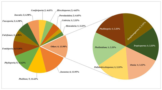 - Wu, F.; Zhou, L.W.; Vlasák, J.; Dai, Y.-C. Global diversity and systematics of Hymenochaetaceae with poroid hymenophore. Fungal Divers. 2022, 113, 1–192. [Google Scholar] [CrossRef]