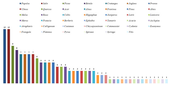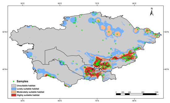 Due to the close relationship between Hymenochaetoid fungi and their host plant, the host plant was also considered as one of the most important covariates restricting the growth of Hymenochaetoid fungi. Therefore, the distribution of each host plant genus associated with Hymenochaetoid fungi (Table S1) was retrieved from the Global Biodiversity Information Facility [63] as one of the variables. The number of host plants on each coordinate was converted to raster data by ArcGIS v.10.8 [66] at a spatial resolution of 30” (approximately 1 km2) for predicting the current geographic distribution of Hymenochaetoid fungi in Central Asia (Figure S1).