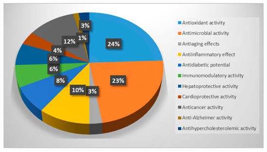 This review demonstrated that freshwater fungi possess significant medicinal potential. As reported in Figure 2, most of them are known to have antioxidant properties, acting against free radical and cellular oxidation processes, and antimicrobial activity against several pathogenic bacteria and fungi of clinical importance. Among the medicinal properties, antiaging effect, antidiabetic potential, anti-inflammatory, immunomodulatory, hepatoprotective, cardioprotective, anticancer, anti-Alzheimer, and antihypercholesterolemic activities were also reported, confirming that this ecological fungal group represents not only an important part of the wide fungal diversity but also a valid alternative source of bioactive compounds useful for human and animal health.