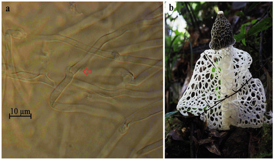 Dikaryotic mycelia and fruiting body of P. echinovolvatus. (a) Microscopic observation of dikaryotic mycelia of the RITF7875 strain where the clamp connections are indicated by arrows. (b) Cultivated P. echinovolvatus under trees in Guangdong Province, China.
