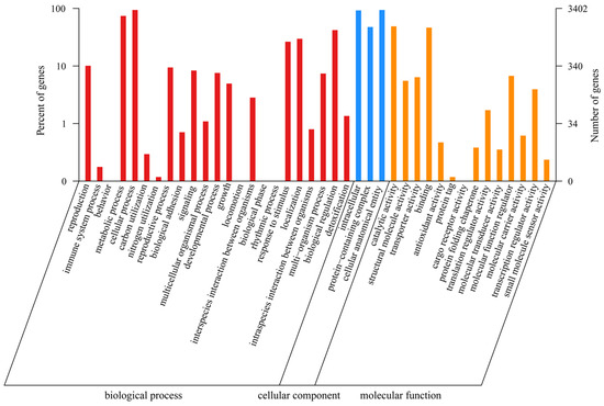 A total of 3402 genes were annotated in the GO database. The GO terms in the Biological Process category were the most common and included “cellular process” (3195 genes), “metabolic process” (2516 genes), and “biological regulation” (1427 genes); within the Cellular Component category, the GO terms “cellular anatomical entity” (3191 genes), “intracellular” (3135 genes), and “protein-containing complex” (1613 genes) were detected; and within the Molecular Function category, the GO terms “catalytic activity” (1659 genes) and “binding” (1576 genes) were detected (Figure 2).