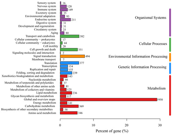 Annotations from the KEGG database were obtained for 3566 genes, which accounted for 34.79% of all the genes. These genes were classified into six major categories: Metabolism (11 branches, 1719 genes), Genetic Information Processing (4 branches, 925 genes), Environmental Information Processing (3 branches, 503 genes), Cellular Processes (5 branches, 814 genes), Organismal Systems (10 branches, 799 genes), and Human Diseases (12 branches, 1276 genes). Within the Metabolism category, the 1719 genes were further classified into 11 subcategories, primarily “Carbohydrate metabolism” (369 genes), “Amino acid metabolism” (346 genes), “Lipid metabolism” (236 genes), “Energy metabolism” (141 genes), “Xenobiotics biodegradation and metabolism” (143 genes), “Metabolism of cofactors and vitamins” (125 genes), and “Glycan biosynthesis and metabolism” (117 genes) (Figure 3).