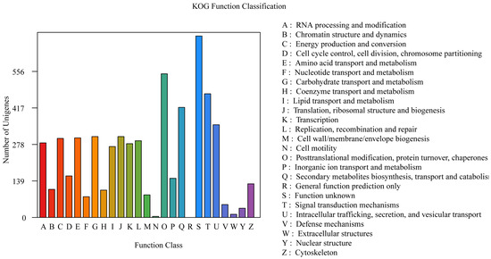 The annotations derived from the KOG database are shown in Figure 3. A total of 5657 genes were annotated in the KOG database, which accounted for 55.18% of all the genes. The results revealed that the genes were enriched in various metabolic processes, including “Posttranslational modification, protein turnover, chaperones” (547 genes), “Signal transduction mechanisms” (471 genes), “Secondary metabolite biosynthesis, transport and catabolism” (419 genes), “Intracellular trafficking, secretion, and vesicular transport” (353 genes), “Carbohydrate transport and metabolism” (308 genes), “Translation, ribosomal structure and biogenesis” (308 genes), “Amino acid transport and metabolism” (303 genes), and “Energy production and conversion” (301 genes) (Figure 4).